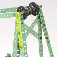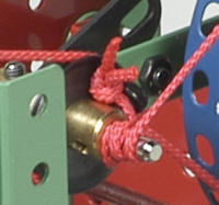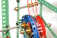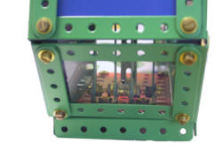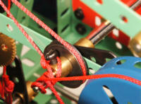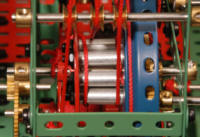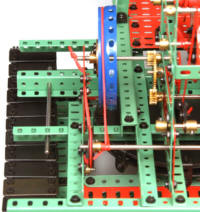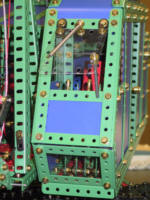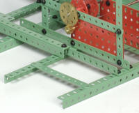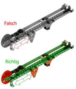 Seite Abschnitt Richtig A 5A04 falsch: 5 x 102080 stattdessen: 5 x 102070 5A05 falsch: 5 x 140101 stattdessen 20 x 140101 5A05 Die Kette muß natürlich zweimal gebaut werden, dazu gehören auch zehn Kettenräder. Die Mengenangaben bei A4 und A5 beziehen sich je auf ein Kettenrad. B 6B01 Die Montage der Laufrollen für die Kette ist nur schwer zu erkennen 6B02 In der Mengenangabe fehlen die Schrauben: 20 x 143006 6B02 Dauerhafter als die in der Bauanleitung abgebildete Version ist die rechts abgebildete Variante. Auf dieses Teil wirken später große Lasten. Die zwölf zusätzlichen Schrauben + Muttern sollten eigentlich in jedem Kasten enthalten sein. (Abgebildet ist nur eine Seite, natürlich sollte dies auf beiden Seiten so gebaut werden.) C 12C01 Die Schrauben für die roten Platten noch nicht fest anziehen. Die Wellen müssen später durch diese beiden Platten und die grosse Platte von C 04 gehen, ohne zu klemmen. Siehe C 05. 12C02 Es empfiehlt sich hier die Passgenauigkeit der mittleren Winkelträger mit den Winkelträgern von Baustufe B zu überprüfen. Ein nachträgliches Justieren ist zwar möglich, aber umständlich. 13C03 beim unteren Teil ist die Schraube unten links nicht wie im oberen Teil verschraubt. Das irritiert. Die Mutter um 2 Loch nach rechts oben versetzen 14C8.1 Das Teil 100100 unter dem Winkelträger ist nicht gut sichtbar (Bild) 18C 10 Das Winkelstück 1x100020 am Ende der Liste streichen 20C 12/13 Das Flachband 100110 ist schon in Bild 12 zu sehen. Deshalb passt hier die Teileangabe nicht zur Bildfolge: Bei C 12 zusätzlich einfügen: 2x100020, 2x143005, 1x143006, 1x100110